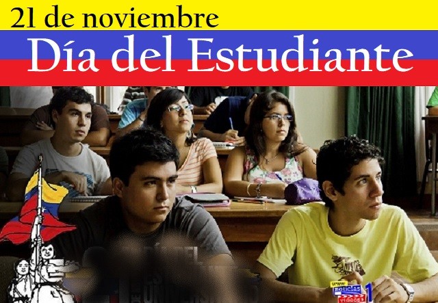 Antes de esta, fecha se conmemoraba, de una manera muy vaga, el 14 de febrero, día de San Valentín y de “Día los Enamorados” como día del estudiante, porque ese día, pero de 1936 en que cae abatido en Caracas el estudiante Eutimio Rivas. Luego se estableció el 21 de noviembre como fecha definitiva del <<Día del Estudiante>>. ¿ Cómo fueron los hechos?. En 1957 ante el anuncio del presidente de Venezuela general Marcos Pérez Jiménez de realizar un plebiscito para el mes de diciembre, el frente estudiantil universitario organiza fuertes protestas dentro de la Universidad Central de Venezuela y que luego se extendió a la Universidad Católica Andrés Bello, contribuyendo en gran medida a la caída del régimen. Estos actos llevaron a declarar el 21 de noviembre como El Día del Estudiante. El Frente Universitario estaba formado por Héctor Rodríguez Bauza por el PCV, Héctor Pérez Marcano por AD, José de La Cruz Fuente por COPEI y José Murrieta por URD. En la Universidad Católica Andrés Bello se quema la Ley Electoral y un retrato de Pérez Jiménez. En la Central, los estudiantes irrumpieron en un Congreso de Cardiología que se realizaba en la Universidad para denunciar la censura oficial, la prohibición de debates en el Congreso y las violaciones a los derechos humanos. Los estudiantes reparten volantes con comunicados y se enfrentan con la policía con piedras y cocteles molotov.
